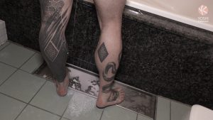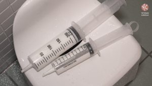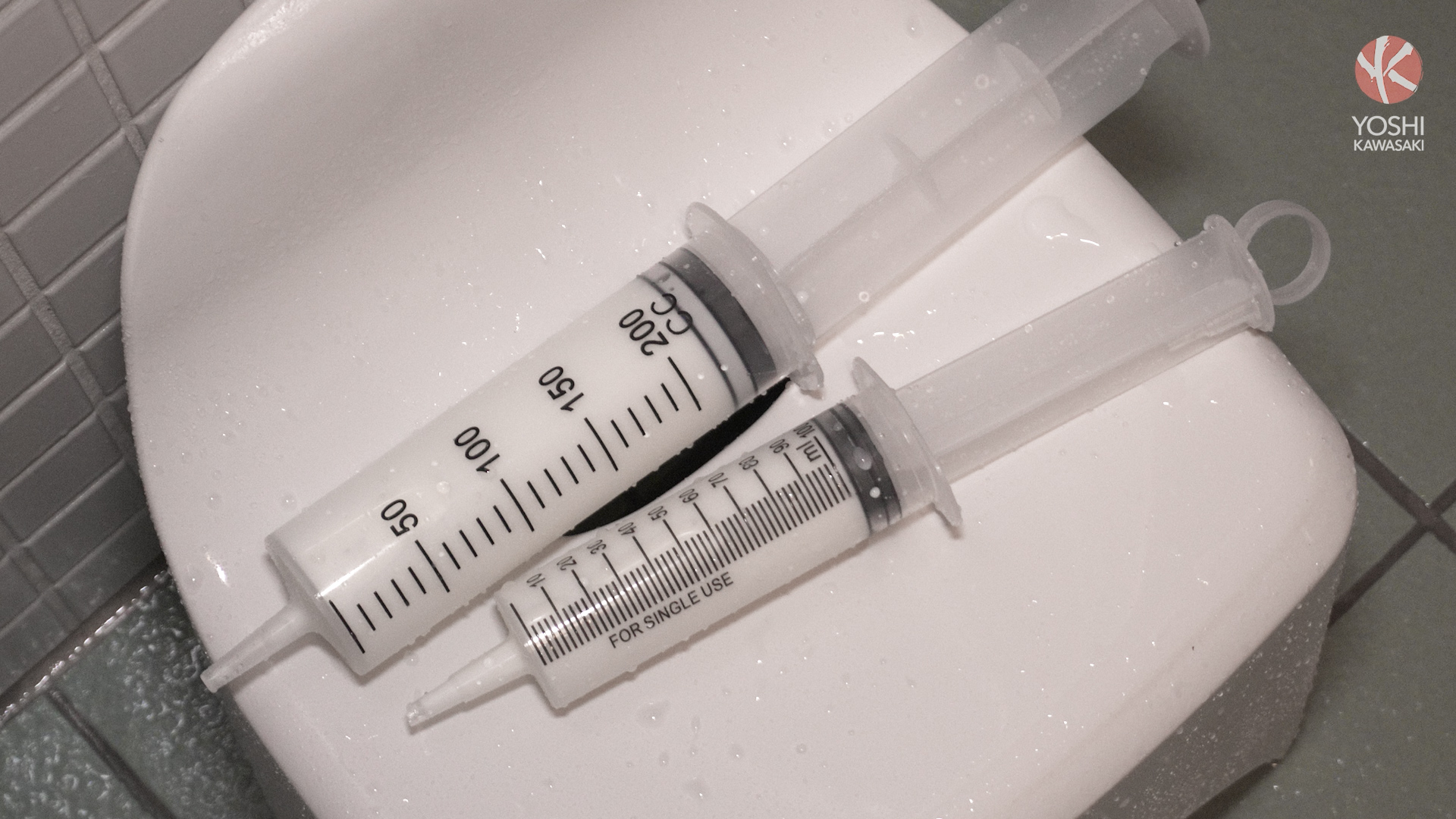 Tonton and Yoshi are about to make a delicious holemade milk shake. First Tonton takes a syringe full of milk and pumps the milk into Yoshi’s hole. As hard as he tries to keep the milk in the twitching hole, some still leaks out. Yoshi blasts milk onto the bathroom floor. Tonton keeps squirting more into Yoshi’s thirsty chute and Yoshi keeps splashing it back out. Yoshi feels as if he’s become a cow in heat. Yoshi pulls his speedo up, holding the milk in. He sprays his milk in the speedo. It gushes out through the speedo, leaving white stains on the swimwear. Yoshi tries to push but it keeps coming out.